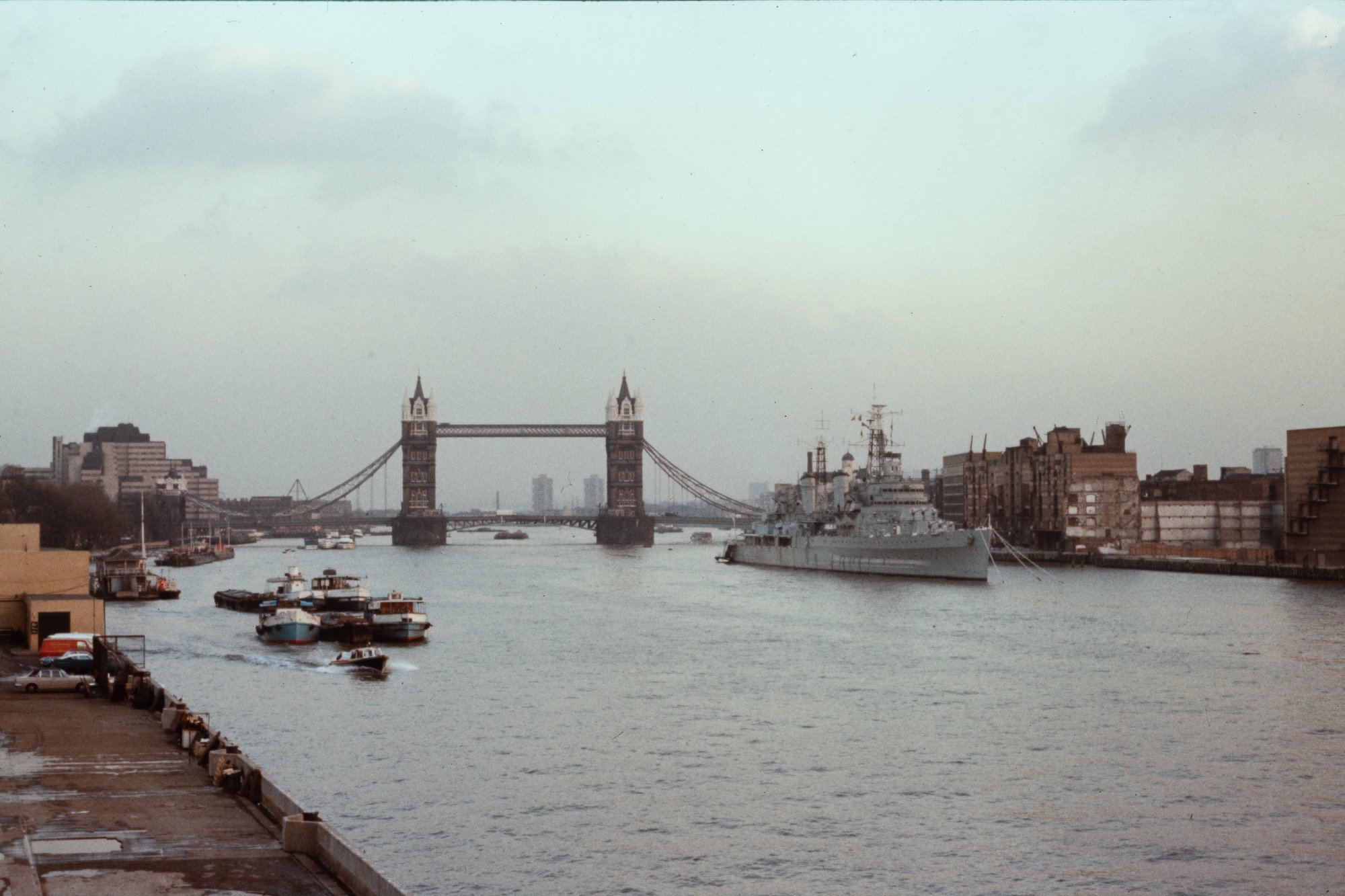 November 1975, Fuji R100 slide. Tower Bridge and HMS Belfast from close to London Bridge. This makes me think of the London of the Sweeney. The old warehouses were still there before succumbing to More London, and Tower Bridge was caked in the soot of London coal smoke.